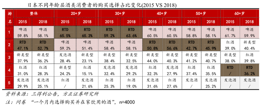 經(jīng)典案例:根據(jù)三得利公告、方正證券研究所等綜合資訊表明,在 20 歲和 30 歲的年齡層中,選擇 RTD 的人數(shù)多于啤酒。到了 2018 年的調(diào)查問卷,發(fā)現(xiàn)選擇啤酒的消費者占比略降,而選擇了 RTD 的消費者明顯增 多,尤其是 40 歲和 50 歲的群體,上升幅度最為明顯。