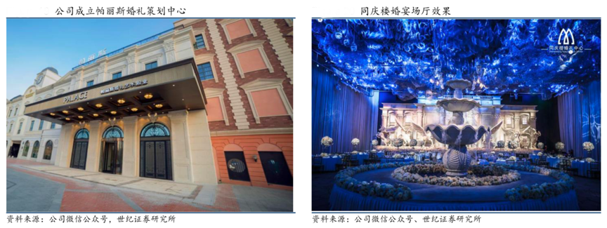 經(jīng)典案例:根據(jù)公司微信公眾號、世紀證券研究所等綜合資訊表明,同慶樓借助自身百年老字號的品牌優(yōu)勢,精準發(fā)力婚宴市場新藍海,2014 年前后,其開始成立婚禮中心。2015 年起開始和國內宴會設計師合作,進行一站式宴會酒店的升級和改造,將原本的傳統(tǒng)宴會廳改造成主題宴會廳。其現(xiàn)已形成了自己的婚慶策劃服務團隊,可向新人們提供場地、菜肴、婚禮策劃、主持、攝影等一站式服務。2019 年,同慶樓在 婚禮堂又進行了不同形態(tài)的嘗試調整,成立帕麗斯婚禮策劃中心,升級 9 家 門店 12 個明星宴會廳,宴會菜肴同步全面升級。