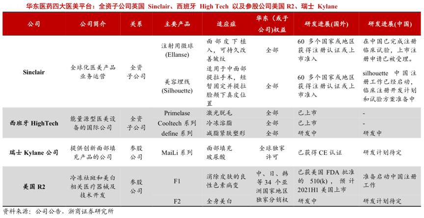 經(jīng)典案例:根據(jù)公司公告、浙商證券研究所等綜合資訊表明,華東醫(yī)藥全資子公司英國 Sinclair、西班牙HighTech 以及參股公司美國R2、 瑞士 Kylane 四個全球化研發(fā)中心,進(jìn)一步整合研發(fā)資源和能力,在面部填充劑、身體塑 形、埋線、能量源器械等領(lǐng)域不斷開發(fā)國際高端醫(yī)美產(chǎn)品技術(shù)及核心產(chǎn)品,積極優(yōu)化提升產(chǎn)品結(jié)構(gòu),豐富和完善產(chǎn)業(yè)布局。