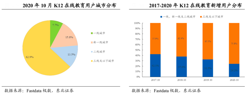 經(jīng)典案例:根據(jù)Fastdata極數(shù)、東北證券等綜合資訊表明,用戶生源結(jié)構(gòu)方面,學(xué)而思網(wǎng)校的付費(fèi)用戶主要來自一二線城市,疫情發(fā)生前 80% 左右的用戶來自一二線城市,20%左右來自低線城市。跟誰學(xué)的用戶分布相對(duì)更均勻,2019年上半年,新生中約一半來自一二線城市,另一半來自低線城市。新東方 在線則雙管齊下,中小學(xué)網(wǎng)校面向一二線城市用戶,東方優(yōu)播則主攻低線城市。