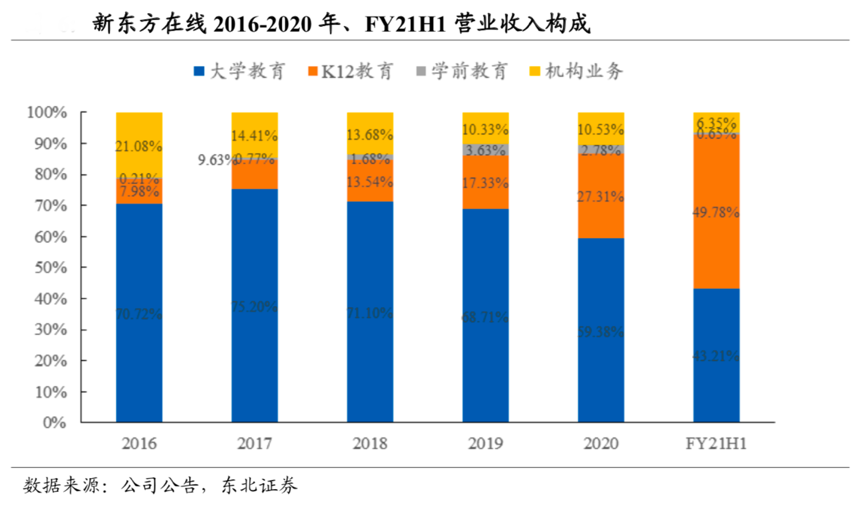 經(jīng)典案例:根據(jù)公司公告、東北證券等綜合資訊表明,從收入結(jié)構(gòu)來看,大學(xué)教育是新東方在線公司的基石業(yè)務(wù),2020財(cái)年占公司營(yíng)收達(dá)59.38%,K12 教 育近年來快速擴(kuò)張,2020 財(cái)年占公司營(yíng)收達(dá) 27.31%,同比增長(zhǎng)9.99pct,自 2019 財(cái)年超越機(jī)構(gòu)業(yè)務(wù)成為營(yíng)收規(guī)模第二大的業(yè)務(wù)。