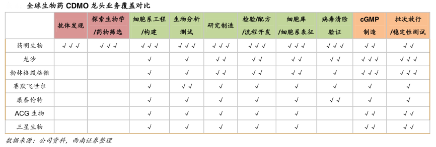 經(jīng)典案例:根據(jù)公司資料、西南證券等綜合資訊表明,對比龍沙、勃林格殷格翰、賽默飛世爾等海外生物藥CDMO 龍頭,藥明生物的業(yè)務(wù)覆蓋了從單抗發(fā)現(xiàn)到商業(yè)化生產(chǎn)的各個階段,從研發(fā)端和生產(chǎn)端進行了全面的覆蓋,尤其是在單抗、雙抗、ADC 藥物發(fā)現(xiàn)端,以及細胞系工程及開發(fā)方面具備優(yōu)勢。