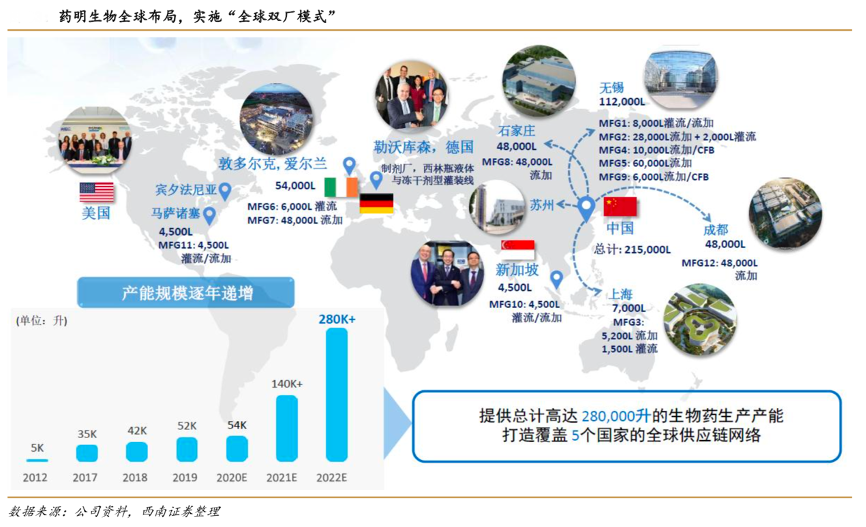 經(jīng)典案例:根據(jù)公司資料、西南證券等綜合資訊表明,藥明生物在中國的無錫、上海、石家莊、成都均有廠房布局設(shè)計,國內(nèi)產(chǎn)能預(yù)計能達到 215 噸。根據(jù)“全球雙廠”策略,藥明生物開始布局海外工廠,首先動工愛爾蘭基地,此外,美國伍斯特、新加坡等地也均有產(chǎn)能布局。通過覆蓋四個國家全球供應(yīng)鏈網(wǎng)絡(luò),保證客戶產(chǎn)品的全球性供應(yīng),并能積極應(yīng)對潛在風險。藥明生物產(chǎn)能規(guī)模逐年提升,2019 年,產(chǎn)能達 52 噸,預(yù)計 2022 年可大幅提升至 280 噸。