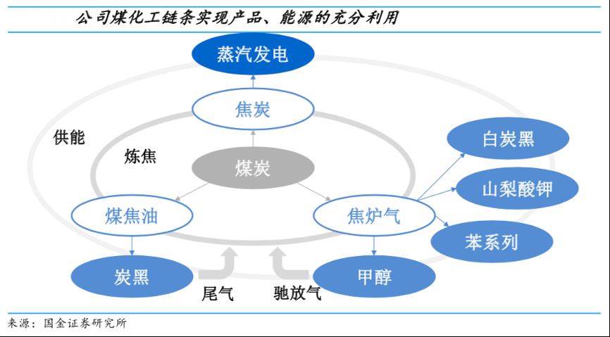 經(jīng)典案例:根據(jù)公司公告、國(guó)金證券研究所等綜合資訊表明,金能科技公司以煤焦化為核心,形成三個(gè)維度的產(chǎn)品線,借助煤炭焦化過(guò)程的蒸汽發(fā)電為化 工產(chǎn)品生產(chǎn)提供“熱電”一體化供應(yīng); 借助煤焦油深加工延伸至炭黑產(chǎn)品生產(chǎn),副產(chǎn)尾氣煉焦; 以焦?fàn)t氣延伸至甲醇、純苯等多種化工產(chǎn)品生產(chǎn), 副產(chǎn)馳放 氣回收用于煉 焦。通過(guò)物料和能源的充分利用,整體構(gòu)筑公司產(chǎn)業(yè)鏈整體的競(jìng)爭(zhēng)優(yōu)勢(shì)。