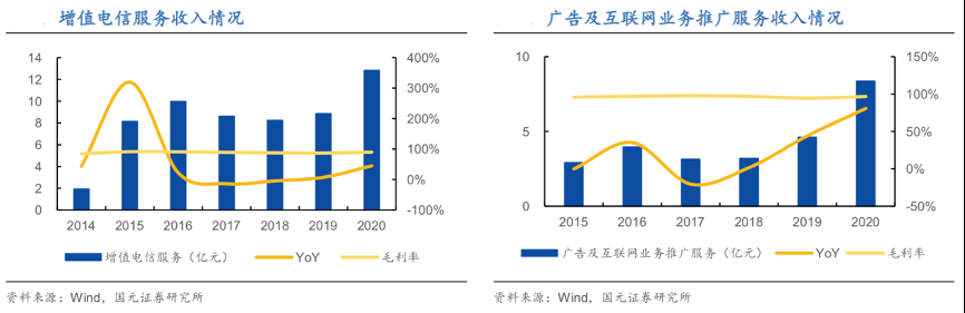經(jīng)典方法:根據(jù)wind、國(guó)元證券研究院等綜合資訊表明,同花順公司目前主要涵蓋四大核心業(yè)務(wù):增值電信服務(wù)、廣告及互聯(lián)網(wǎng)業(yè)務(wù)推廣服務(wù)、軟件銷(xiāo)售及維護(hù)、基金銷(xiāo)售及其他交易手續(xù)費(fèi)等其他業(yè)務(wù)。其近年主營(yíng)業(yè)務(wù)保持穩(wěn)健發(fā)展態(tài)勢(shì),2018-2020年,增值電信服務(wù)營(yíng)業(yè)收入 CAGR 達(dá) 24.93%,廣告及互聯(lián)網(wǎng)業(yè)務(wù)推廣服務(wù)營(yíng)業(yè)收入CAGR 達(dá) 61.52%,其不斷豐富業(yè)務(wù)外延,深耕流量變現(xiàn)邏輯,業(yè)務(wù)發(fā)展更加多元化。