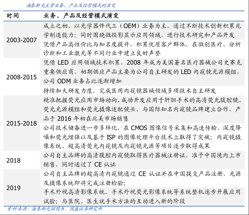 經(jīng)典案例:根據(jù)海泰新光招股書(shū)、國(guó)盛證券研究所等綜合資訊表明,海泰新光公司主要產(chǎn)品和業(yè)務(wù)模式隨著其業(yè)務(wù)與技術(shù)發(fā)展逐步演變,2003-2007年,其持 續(xù)積累和發(fā)展光學(xué)設(shè)計(jì)和加工技術(shù),為進(jìn)入醫(yī)用內(nèi)窺鏡器械領(lǐng)域建立了良好的基礎(chǔ);2008年至今,其持續(xù)進(jìn)行醫(yī)用內(nèi)窺鏡技術(shù)的創(chuàng)新和投入,完成技術(shù)與產(chǎn)品質(zhì)量?jī)?yōu)勢(shì)的逐漸強(qiáng)化。