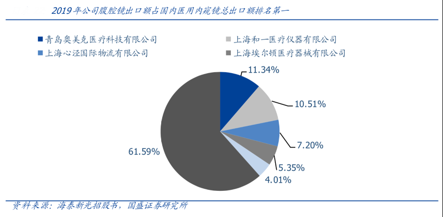 經(jīng)典案例:根據(jù)海泰新光招股書(shū)、國(guó)盛證券研究所等綜合資訊表明,經(jīng)過(guò)十余年的合作,其與國(guó)際頂尖醫(yī)療器械公司的合作逐漸深入,業(yè)務(wù)范圍不斷擴(kuò)大,快速設(shè)計(jì)并生產(chǎn)出符合其更新?lián)Q代需求的配套產(chǎn)品的能力。2019 年國(guó)內(nèi)醫(yī)用內(nèi)窺鏡出口 總額為 8135.46 萬(wàn)美元,其中公司主要產(chǎn)品腹腔鏡的出口金額為 922.95 萬(wàn)美元,占全國(guó)內(nèi)窺鏡總出口金額的比例為 11.34%,排名第一。