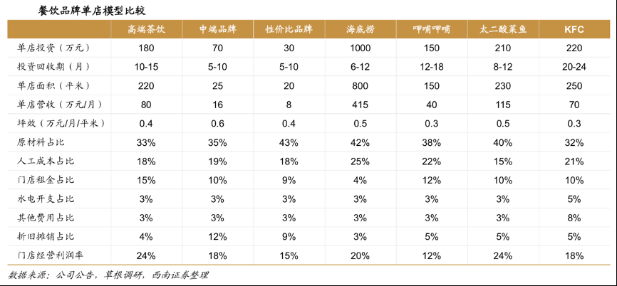 經(jīng)典案例:根據(jù)公司公告、草根調(diào)研、西南證券等綜合資訊表明,現(xiàn)制茶飲生意單店面積小、選址靈活、也不需要店員具備后廚經(jīng)驗,非連鎖普通茶飲店投資門檻 20 萬元起步、每月坪效能達(dá)到 2000 元,單店經(jīng)營利潤率與快餐、中餐等其他餐飲業(yè)態(tài)相比同樣具備投資吸引力。