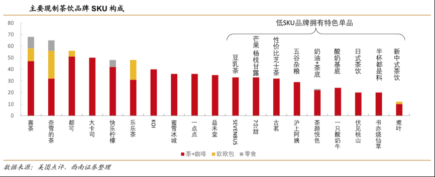 經(jīng)典案例:根據(jù)美團點評、西南證券等綜合資訊表明,冰博克牛乳、豆乳、芝士奶油頂、氣泡水這類曾經(jīng)某個品牌的創(chuàng)新產(chǎn)品已成為多個新式茶飲品牌菜單的常駐品。奈雪、喜茶的推新速度在 1-1.2 款/周,除了茶飲相關(guān)產(chǎn)品,兩者還在瓶裝水、餐飲副牌的領(lǐng)域試水經(jīng)營。而小店經(jīng)營的模式并不適合提供多樣化的 SKU,茶顏悅色、蜜雪冰城一年上新款式不到 5 個。