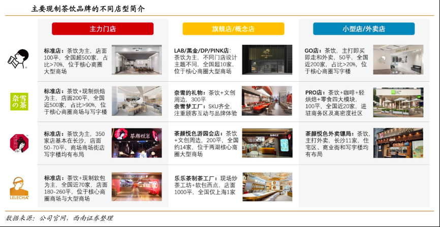 經(jīng)典案例:根據(jù)公司官網(wǎng)、西南證券等綜合資訊表明,部分現(xiàn)制茶飲品牌嘗試多種店型運(yùn)作,逐步優(yōu)化渠道組合。主力店以外的門店拓展分為兩個(gè)大類,第一類以展示品牌形象、增加消費(fèi)者互動(dòng)為目的,這類店型面積大、設(shè)計(jì)交互感強(qiáng),如奈雪夢(mèng)工廠、茶顏悅色游園會(huì)。第二類以提升單店效率為目的,側(cè)重即買即走和外賣業(yè)務(wù),門店面積小、讓高端品牌將渠道拓展至辦公場(chǎng)所、社區(qū)的同時(shí),也能實(shí)現(xiàn)較主力店型同等或更高水平的經(jīng)營(yíng)利潤(rùn)率,奈雪 PRO、喜茶 GO 均為該類店型。