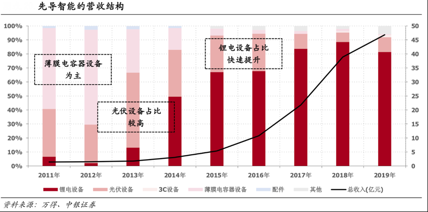 經(jīng)典案例:根據(jù)萬(wàn)得、中銀證券等綜合資訊表明,2013年以前,薄膜電容器設(shè) 備貢獻(xiàn)了先導(dǎo)智能公司大部分的收入。在切入光伏和鋰電池領(lǐng)域后,2013年前后光伏行業(yè)的高景氣度拉動(dòng)其光伏設(shè)備收入快速提升。先導(dǎo)智能公司的卷繞機(jī)技術(shù)成功遷移到鋰電池設(shè)備領(lǐng)域,而伴隨著新能源汽車普及程度的提高,鋰電設(shè)備收入迅速提升,拉動(dòng)其業(yè)績(jī)快速增長(zhǎng)。