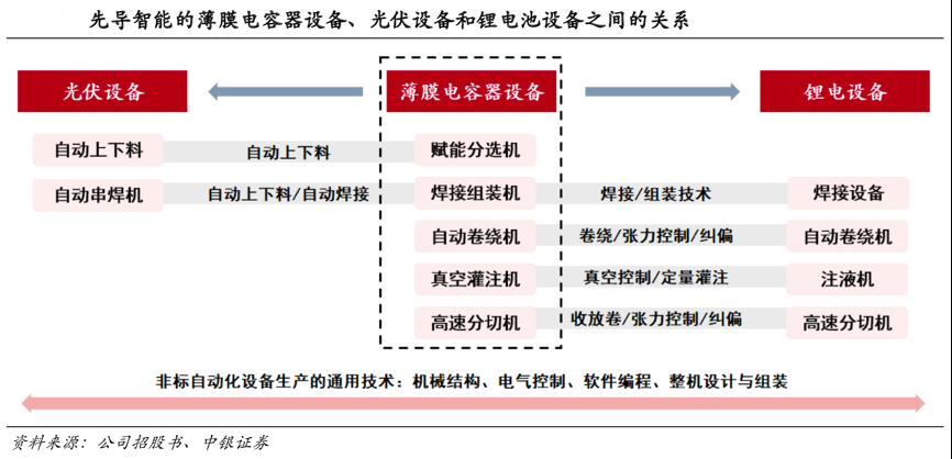 經(jīng)典案例:根據(jù)公司招股書(shū)、中銀證券等綜合資訊表明,先導(dǎo)智能卡位技術(shù)含量高、工藝地位關(guān)鍵的全自動(dòng)卷繞機(jī),開(kāi)發(fā)薄膜電容器制造的成套自動(dòng)化設(shè)備。在薄膜電容器設(shè)備的生產(chǎn)與研發(fā)中,其一方面積累了機(jī)械結(jié)構(gòu)、電氣控 制、軟件編程和整機(jī)設(shè)計(jì)與組裝等非標(biāo)自動(dòng)化設(shè)備生產(chǎn)的通用技術(shù),另一方面掌握了自動(dòng)卷繞、高速分切技、噴金、賦能分選等與電容器制造相關(guān)的核心技術(shù)。憑借“通用”+“專用”的技術(shù)銜接,先導(dǎo)智能成功進(jìn)入下游景氣旺盛的鋰電池設(shè)備和光伏設(shè)備領(lǐng)域。