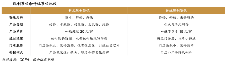 經(jīng)典案例:根據(jù)CCFA、西南證券等綜合資訊表明,與傳統(tǒng)茶飲相比,新式茶飲的“新”主要體現(xiàn)在新鮮食材、新技術(shù)、新視角呈現(xiàn)品牌價值三個方面。一是新式茶飲使用新鮮品質(zhì)食材,用水果、原葉茶、奶蓋及牛乳替代果醬、茶粉、奶精,產(chǎn)品客單價也較高;二是加工制售過程中重視數(shù)字化和新技術(shù)應(yīng)用;三是通過大店、品牌聯(lián)名等新視角呈現(xiàn)品牌價值,重視顧客的體驗和品牌認(rèn)同感。