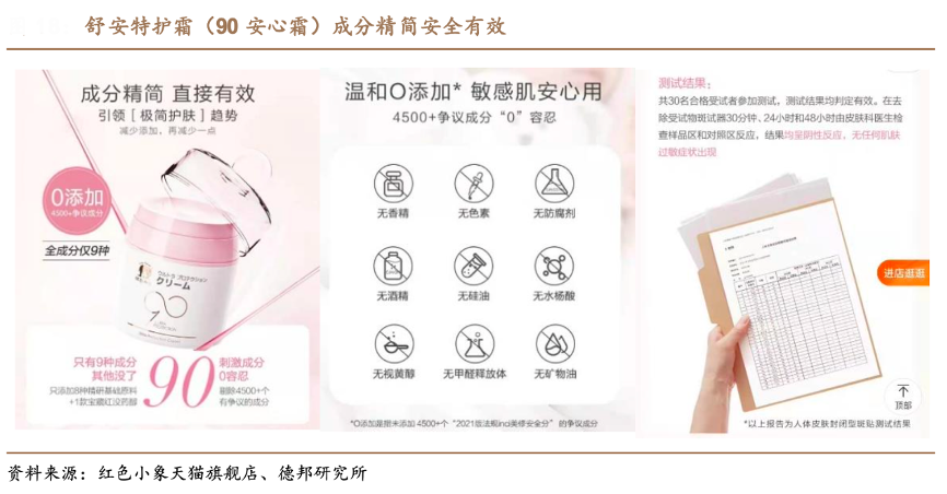 經(jīng)典案例:根據(jù)紅色小象天貓旗艦店、德邦研究所等綜合資訊表明,紅色小象品牌致力于使用基于技術(shù)的無添加劑天然成分,明星產(chǎn)品舒安特護(hù)霜(90安心霜)為例,8種經(jīng)典基礎(chǔ)原料(如巴西菊樹樹皮)+1 款提純的天然紅沒藥醇,“9”種成分將精簡做到極致,同時(shí)滿足舒緩、保濕、維穩(wěn)功效;無香精、無防腐劑、無硅油、無酒精等,“0”添加 4500 余種“2021 版法規(guī) inci 美修安全分”中的爭議成分,力保產(chǎn)品的溫和安全,真正通過成分的添加及復(fù)配研究,實(shí)現(xiàn)安全與功效的雙重保障。