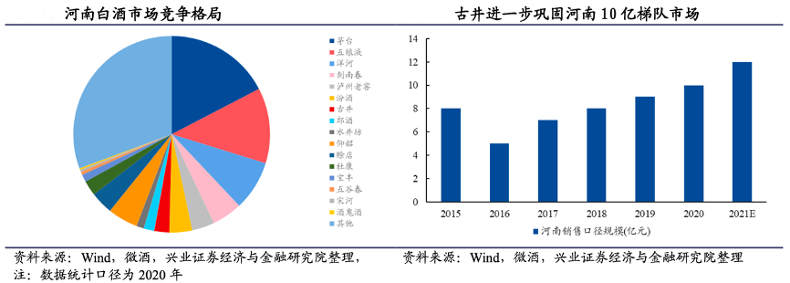 經(jīng)典案例:根據(jù)wind、徽酒、興業(yè)證券經(jīng)濟與金融研究院等綜合資訊表明,古井 2010 年便開始布局河南市場,先后主打 40-45 元老玻貢、古井獻禮版、古井幸福版等,產(chǎn)品以中低端為主,銷售起勢后提出打造第二個安徽市場的口號。但由于產(chǎn)品中低端定位及銷售管控不足,短期銷售規(guī)模下滑明顯。2018年其開始轉(zhuǎn)變思路,主打古7/古 8 中國香、古 20 等高價位產(chǎn)品,同時在河南進行了人事調(diào)整和渠道下沉,復(fù)制“三通工程”實行深度分銷,逐步形成以鄭州為中心的板塊市場,以點帶面打開增長空間,最終拿下周口、商丘、開封等地區(qū)市場。