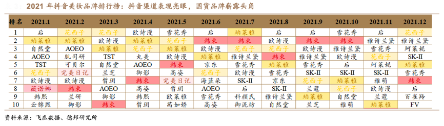 經(jīng)典案例:根據(jù)飛瓜數(shù)據(jù)、德邦研究所等綜合資訊表明,近年來(lái),抖音成為國(guó)際品牌、國(guó)貨品牌、新銳品牌各大化妝品品牌爭(zhēng)搶的流量平臺(tái)。2021年,抖音美妝品牌排行榜上,韓束連續(xù)多月銷售額排名前十,累計(jì)四個(gè)月位列第二,表現(xiàn)亮眼。