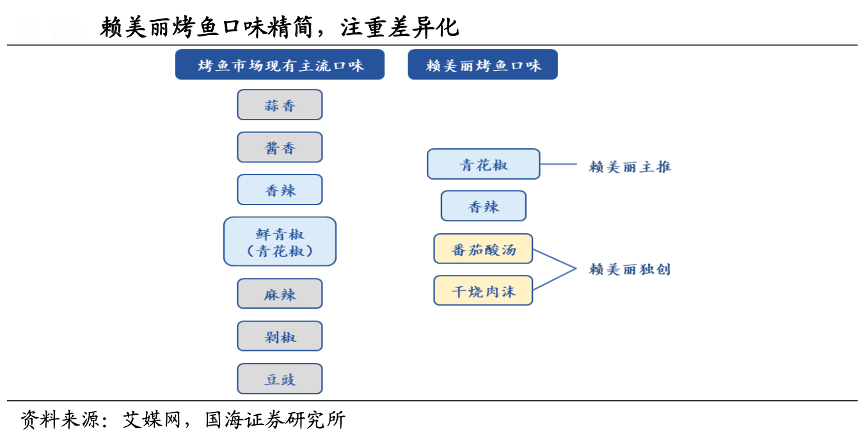 經典案例:根據艾媒網、國海證券研究所等綜合資訊表明,產品方面,賴美麗采用“江團魚”與傳統的凌波魚等做出差異化,食材為品牌私有魚塘養(yǎng)殖的江團魚。其主推大單品青花椒烤魚并且強調“只賣活魚”,打造以“彈牙”為核心賣點的極致新鮮品牌形象。