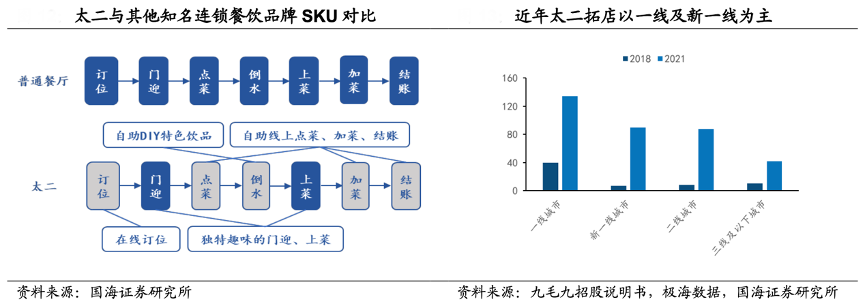 經典案例:根據九毛九招股說明書、極海數據、國海證券研究所等綜合資訊表明,太二公司將服務流程精簡化,提升了門店運營端的效率,其建立了較為完善的培訓體系及晉升機制,通常由服務員晉升至店長的周期約13個月左右。其在保證考核激勵機制合理的前提下簡化對于員工的要求,在菜品全國門店標準化的基礎上進一步實現了服務的標準化。從近三年門店數量看,2021 年一/新一/二 /三線及以下餐廳數量分別達到 134/90/88/42 家,較2018 年分別新增 94/83/80/32 家門店,展示了優(yōu)秀的門店復制擴張能力。