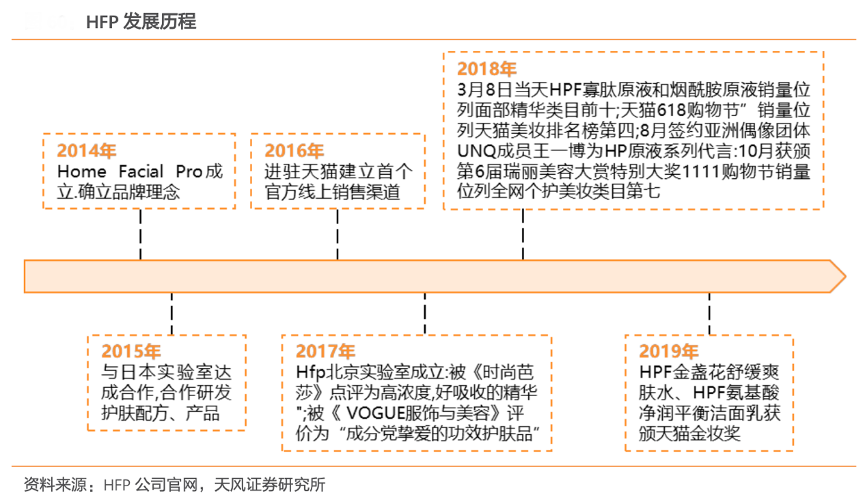經典案例:根據HFP公司官網、天風證券研究等綜合資訊表明,HomeFacialPro簡稱 HFP, 成立于 2014 年,是國內主打成分的功效護膚品牌。其擁有原液、面膜、潔面卸妝、水 乳面霜、精華等系列產品。HomeFacialPro 本意是“在家也能用的功效護膚品”,品牌秉持“以成分,打動肌膚”的理念,從消費者肌膚訴求出發(fā),用簡潔的態(tài)度追求本質護膚功效, 精簡配方不作冗余添加,為當下年輕一代定制更具針對性的精簡護膚方案。