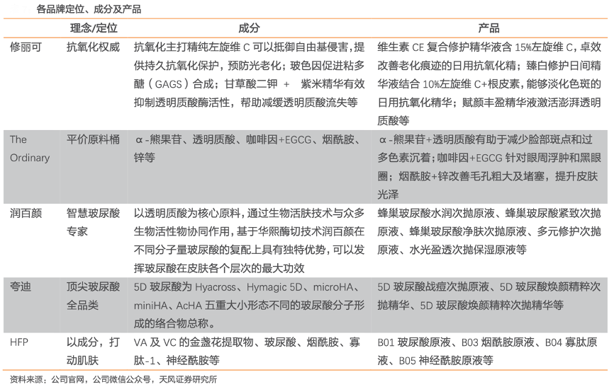經典案例:根據公司官網、公司微信公眾號、天風證券研究等綜合資訊表明,The Ordinary 以高濃度成分為特點,售價在百元以內,有“平價原料桶”之稱,產品涵蓋面非常廣,無論是油皮、痘皮、混合皮,還是敏感皮、干皮,都能從中找到合適的產品。華熙生物潤百顏和夸迪以多種分子大小的玻尿酸為核心原料,代表性產品次拋產品深入人心;HFP 秉持“以成分打動肌膚”,精簡配方不作冗余添加,為當下年輕一代定制更具針對性的精簡護膚方案。