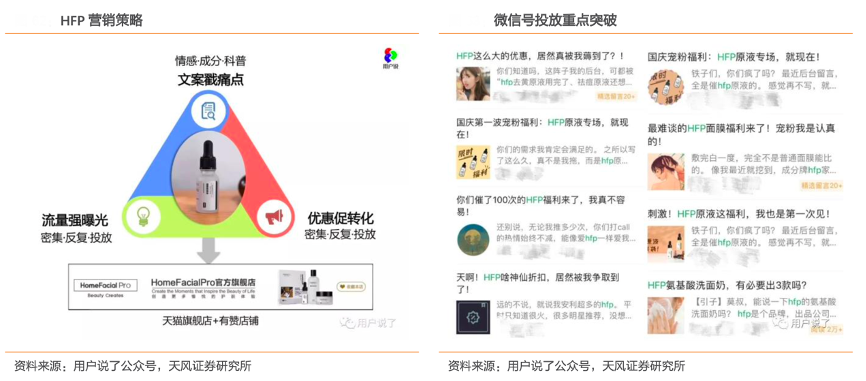 經(jīng)典案例:根據(jù)用戶說了公眾號、天風證券研究等綜合資訊表明,2016年 HFP 就借助微信公眾號的流量紅利開啟了國貨社交媒體營銷的 1.0 時代,通過大量投放各類微信公眾號,提供粉絲福利,擴大了消費者認知。HFP 利用消費者對于微信的信任感不斷對消費者進行 科普和宣傳,完成客戶的獲取、銷售轉(zhuǎn)化,以及沉淀至官方公眾號和天貓旗艦店的用戶留存。HFP充分抓住了疫情機遇,在微信私域流量的開拓已經(jīng)形成了一個完整的引流-營銷-消費-固客-回購的微信生態(tài)閉環(huán)利用私域流量帶來銷售增量。