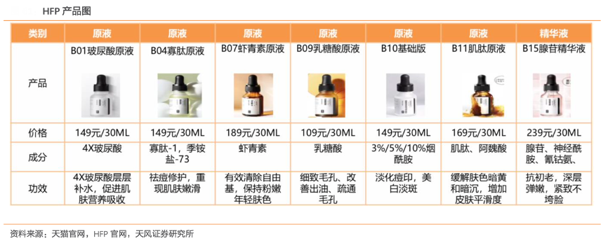 經(jīng)典案例:根據(jù)天貓官網(wǎng)、HFP官網(wǎng)、天風證券研究等綜合資訊表明,在產(chǎn)品命名上,HomeFacialPro 的每款產(chǎn)品都以核心成分和功效命名,如“HFP 乳糖酸去黑頭鼻貼”,“金盞花舒緩爽膚水”等, 通過簡單易懂的方式幫助消費者挑選到適用的護膚品,輔以不同濃度的成分添加;另外,分系列以成分命名進行編號,讓成分護膚植入到更多消費者的觀念中,給消費者更佳的體驗。