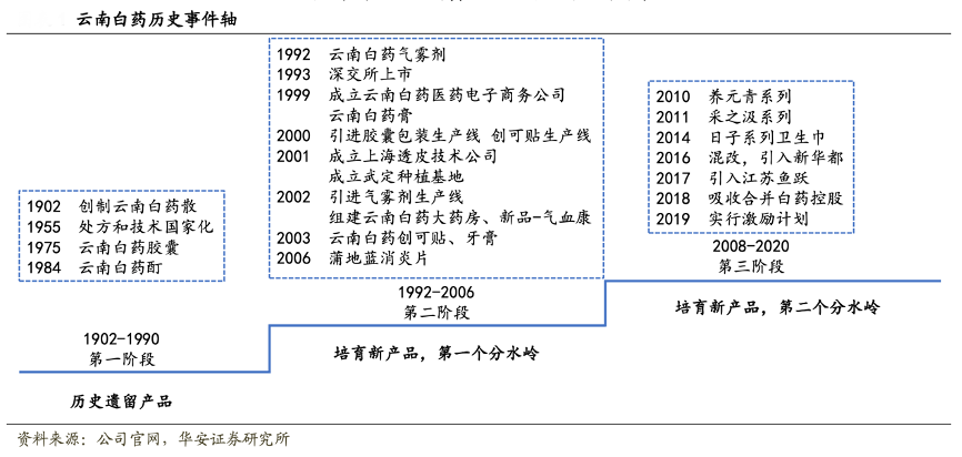 經(jīng)典案例:根據(jù)公司官網(wǎng)、華安證券研究所等綜合資訊表明,云南白藥,原名“萬(wàn)應(yīng)百寶丹”,于 1902 年由云南民間名醫(yī)曲煥章創(chuàng)制,擁有 國(guó)家機(jī)密級(jí)配方,受到永久性保護(hù)。云南白藥集團(tuán)股份有限公司前身是 1971 年建 立的云南白藥廠,1993 年在深交所掛牌上市,成為云南省首家上市公司。其主要經(jīng)營(yíng)涉及化學(xué)原料藥、化學(xué)藥制劑、中成藥和中藥材等,擁有云南白藥散劑和云南 白藥膠囊兩個(gè)國(guó)家一級(jí)中藥保護(hù)品種,以事業(yè)部的形式,按照產(chǎn)品系列及服務(wù)劃分 四大業(yè)務(wù)板塊,較早實(shí)施多元化戰(zhàn)略。