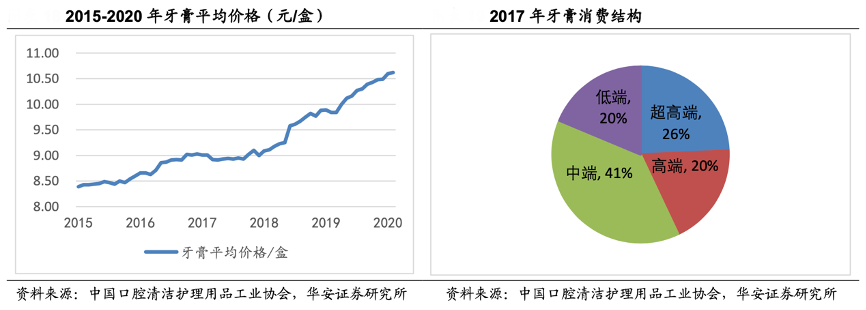 經(jīng)典案例:根據(jù)中國口腔清潔護理用品工業(yè)協(xié)會、華安證券研究所等綜合資訊表明,隨著中國口腔清潔護理產(chǎn)品市場高端化趨勢愈 加明顯,高端、超高端價位的牙膏占比有望進一步提升。云南白藥牙膏定位準確,高端市場是牙膏趨勢。消費結(jié)構(gòu)上,2017 年超高端 (平均價格>15 元/100g)和高端牙膏(9 元/100g<平均價格≤15 元/100g)合計 市場份額達到 46%,占據(jù)主要市場。同時從 2015-2020 年牙膏平均價格趨勢上,也可看到牙膏的均價也在整體向上。