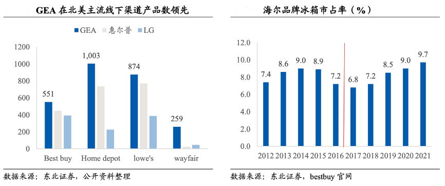 經(jīng)典案例:根據(jù)東北證券、bestbuy官網(wǎng)、公開(kāi)資料等綜合資訊表明,GEA 擁有完善的供應(yīng)鏈網(wǎng)絡(luò),在美國(guó)擁有9 家制造工廠,13 個(gè)分銷中 心及 143 個(gè)區(qū)域貨運(yùn)中心,配送服務(wù)覆蓋全國(guó) 90%地區(qū)。通過(guò)北美家電線上渠道官網(wǎng)如 Bestbuy,Home depot 等我們可以看 到,GEA 產(chǎn)品在北美各大渠道銷售數(shù)量領(lǐng)先。除了傳統(tǒng)大型商超以外,GEA 與 Sears 等全美四大連鎖家電零售商也長(zhǎng)期保持合作關(guān)系。海爾收購(gòu) GEA 后,借用 GEA 的 渠道,逐步推廣海爾品牌的產(chǎn)品,自 2016 年后,海爾品牌的冰箱市場(chǎng)份額實(shí)現(xiàn)了快 速穩(wěn)定增長(zhǎng)。
