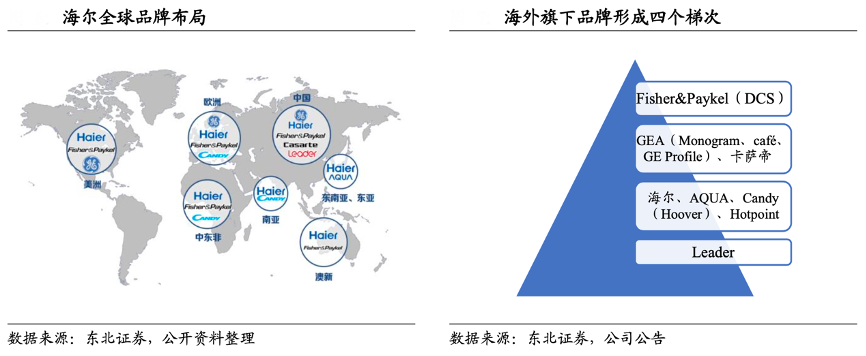 經(jīng)典案例:根據(jù)東北證券、公司公告、公開資料等綜合資訊表明,海爾公司通過自主發(fā)展和并購形成了七大品牌集群。橫向跨越五大洲,覆蓋全球市場;縱向形成以斐雪派克為引領(lǐng)的超高端品牌、以卡薩帝和 GEA 為引領(lǐng)的高端品牌、包括海爾、Candy 和 AQUA 的主流品牌以及聚焦年輕細分市場的 Leader 四大品牌梯次,采取以用戶為中心的差異化的多品牌策略,實現(xiàn)了廣泛而深入的用戶覆蓋。