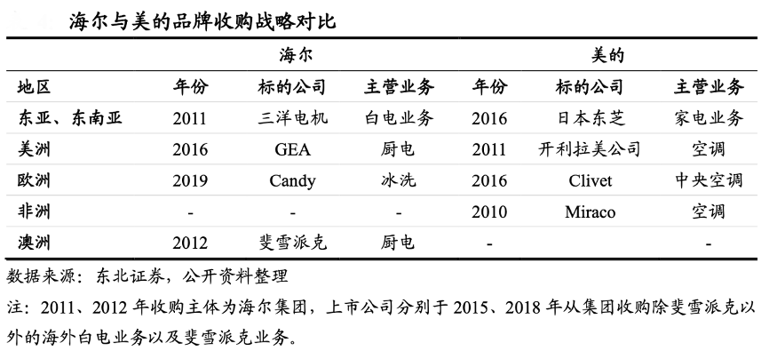 經(jīng)典案例:根據(jù)東北證券、公開資料等綜合資訊表明,自 90 年代初期開始實行國際化經(jīng)營戰(zhàn)略以來,海爾堅持“不做貼牌做創(chuàng)牌”的經(jīng)營方針,憑借前期大規(guī)模投入積累的品牌聲量以及后期的成功戰(zhàn)略并購,目前已經(jīng)成為我國白電出海知名品牌,自有品牌收入占比近100%。在競爭對手的海外業(yè)務(wù)收入占比保持穩(wěn)定的時候,海爾的海外業(yè)務(wù)占比穩(wěn)定增長,到 2020 年已經(jīng)超過了美的,實現(xiàn)了后來者居上。