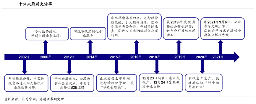 經典案例:根據公司官網、海通證券研究所等綜合資訊表明,2016年千味央廚從思念體系獨立,明確了“只為餐飲、廚師之選”、“餐飲專供速凍米面領導品牌”的企業(yè)定位和發(fā)展方向,成為百勝中國 T1 級經銷商;2018年獲得京東集團領投、絕味食品跟投的共計1億元投資,占千味央廚約10%股權,投資完成后公司整體估值約 10 億元。2021 年 9 月 6 日,其在深交所上市。