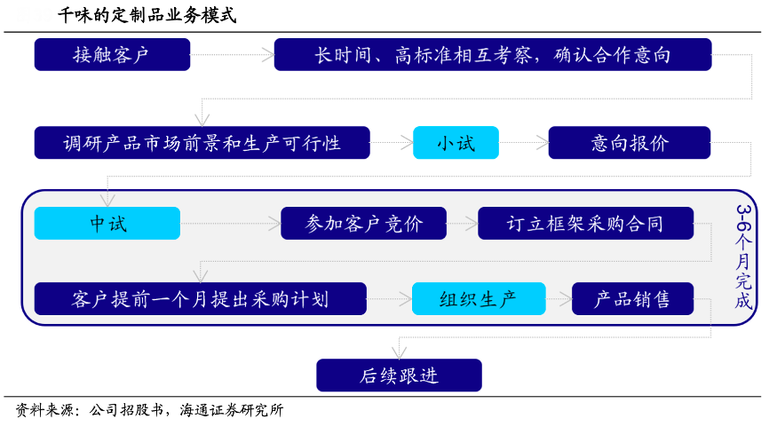 經典案例:根據公司招股書、海通證券研究所等綜合資訊表明,千味公司單獨設立“重客部”來對大型餐飲企業(yè)客戶提供整體解決方案,包括產品開發(fā)、菜單設計、技術支持、提供加工和后廚布局建議等服務以滿足客戶的多方面需求。其中,定制化的產品研發(fā)服務是直銷業(yè)務的 核心,2017-2020 年,公司直銷渠道定制品銷售收入分別為2.1 億元、2.4 億元(+17%)、 3.1 億元(+30%)、2.8 億元(-10%),占直銷收入比例維持在80%以上。