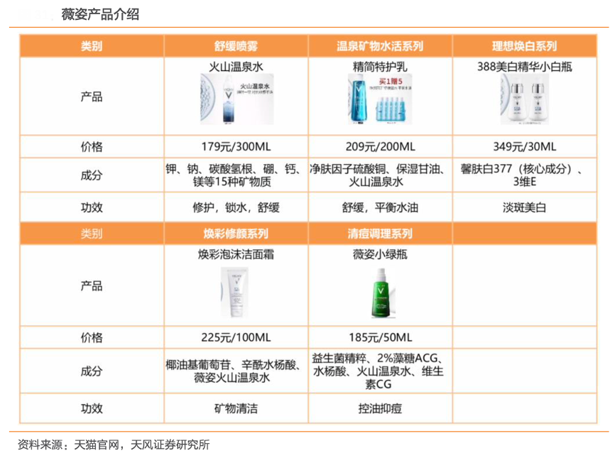 經(jīng)典案例:根據(jù)天貓官網(wǎng)、天風(fēng)證券研究所等綜合資訊表明,薇姿產(chǎn)品源于法國藥房,安全、高效、富含薇姿火山溫泉水。其成立至今堅持使用最純淨(jìng)、最具活性的 VICHY 溫泉水為原料,堅持為消費者守護肌膚健康而努力。產(chǎn)品的 類型覆蓋卸妝品、面膜、乳液、化妝水、凈化、噴霧等 12 個類型,具有改善細紋、防曬 隔離、淡化暗沉、光澤皮膚等功效。產(chǎn)品經(jīng)過臨床實驗證明,獲得專業(yè)皮膚科醫(yī)師的推薦。