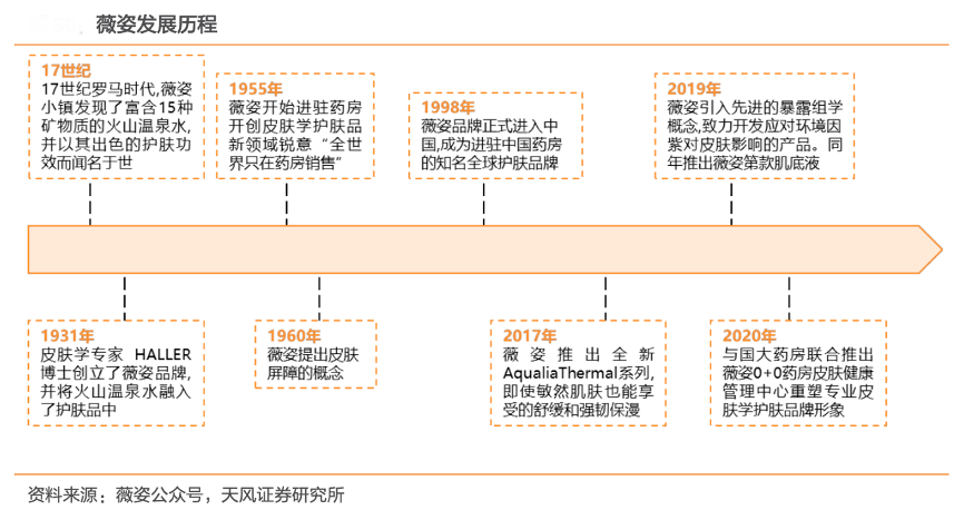 經(jīng)典案例:根據(jù)薇姿公眾號、天風(fēng)證券研究所等綜合資訊表明,1931年皮膚學(xué)專家 HALLER 博士創(chuàng)立了全球第一個醫(yī)美品牌精姿,并將火山溫泉水應(yīng)用于護膚品中,最初產(chǎn) 品僅在藥房銷售。1998 年,薇姿作為全球知名護膚品配牌進入中國市場,2020 年與國大藥房聯(lián)合推出薇姿 0+0 藥房皮膚健康管理中心,重塑專業(yè)皮膚學(xué)護膚品牌形象。薇姿先后提出了皮膚屏障和暴露組學(xué)概念,并且致力于研發(fā)應(yīng)對環(huán)境因子對皮膚影響的產(chǎn)品。