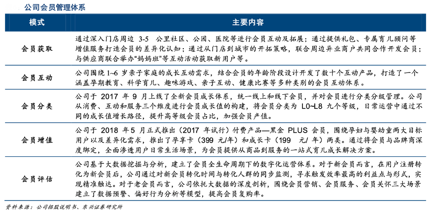 經(jīng)典案例:根據(jù)公司招股說明書、東興證券研究所等綜合資訊表明,通過多年深入研究會員關系管理,孩子王公司建立了包括“會員獲取”、“會員互動”、“會員分類”、“會員增值”和 “會員評估”在內的一整套閉環(huán)會員管理體系,并與領先的大數(shù)據(jù)技術和門店場景化優(yōu)勢相結合,形成了完善的以情感為紐帶的會員制模式。