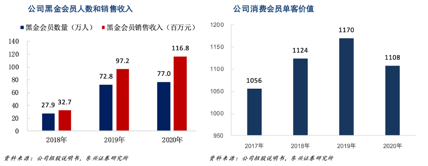經(jīng)典案例:根據(jù)公司招股說明書、東興證券研究所等綜合資訊表明,孩子王為進一步提高單客產(chǎn)值,對會員進行了更加精細 化的運營。其于2018 年 5 月推出付費黑金 PLUS 會員,分別針對孕婦和嬰幼童兩大目標用戶推出了孕享卡(399 元/年) 和成長卡(199 元/年),有效期均為 1 年,到期后自動作廢。消費者在預付會員卡款項后可享受會員卡內相 關服務,其中包含于特定時期獲取特定禮物,消費折扣及其他增值服務。截至 2020 年末公司累計黑金會員 規(guī)模超過 70 萬人,會員數(shù)量和銷售收入逐年增加,2018 年-2020 年黑金會員單個會員平均收入分別為117.36 元/133.53 元/151.71 元,2020 年付費會員單客年產(chǎn)值為普通會員的 10 倍。