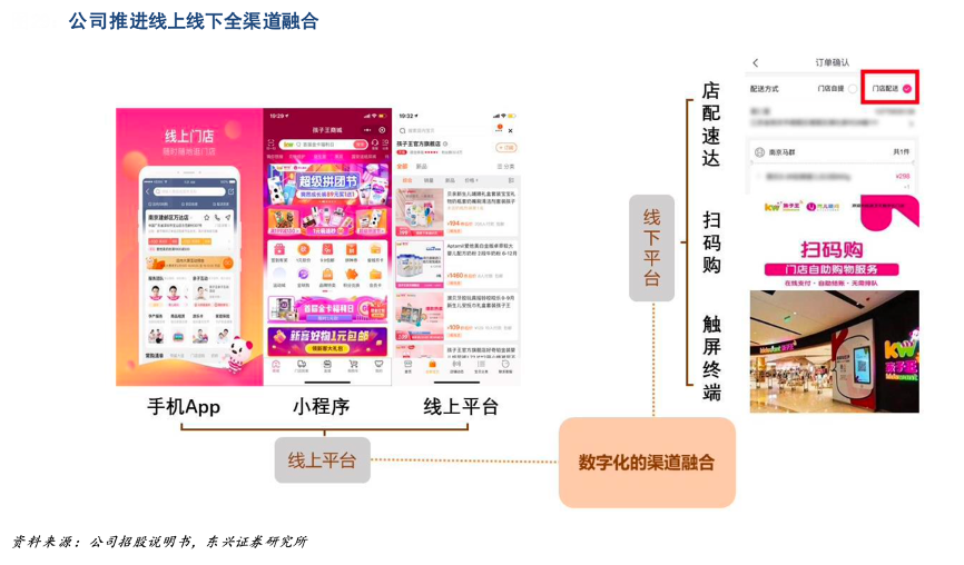 經(jīng)典案例:根據(jù)公司招股說(shuō)明書(shū)、東興證券研究所等綜合資訊表明,孩子王公司已完成線上線下融合的數(shù)字化搭建,消費(fèi)者可通過(guò)線上平臺(tái)、APP、微信小程序,或線下觸屏終端、“掃碼購(gòu)”自助下單、“店配速達(dá)”等多種渠道獲得更加流暢、便捷的消費(fèi)體驗(yàn)。其可通過(guò)全渠道營(yíng)銷網(wǎng)絡(luò)建立品牌和用戶互相 感知和交互的多個(gè)觸點(diǎn),及時(shí)準(zhǔn)確地滿足消費(fèi)者全方位的消費(fèi)需求。