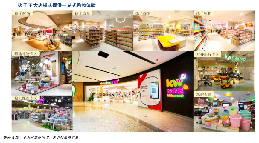 經(jīng)典案例:根據(jù)公司招股說(shuō)明書(shū)、東興證券研究所等綜合資訊表明,孩子王在全國(guó)首創(chuàng)大店模式,平均單店面積約 2500 平方米,最大單店面積超過(guò) 7000 平方米,且均采取直營(yíng)模 式,而同業(yè)參與者均以 1000 m²以下的中小店為主,且多以加盟形式為主。其單店面積較大,商品種類豐富,涵蓋了嬰幼兒的衣、食、住、行,為消費(fèi)者提供了“一站式”的良好購(gòu)物體驗(yàn)。同時(shí),在提供母嬰產(chǎn)品服務(wù)的基礎(chǔ)上,其還提 供兒童游樂(lè)場(chǎng)及 母嬰配套服務(wù),增加了玩、學(xué) 、交流互動(dòng)等體驗(yàn)場(chǎng)景,形成了“商品+服務(wù)+社交”的創(chuàng)新性運(yùn)營(yíng)模式,在行業(yè)內(nèi)形成了較為獨(dú)特的競(jìng)爭(zhēng)優(yōu)勢(shì)。
