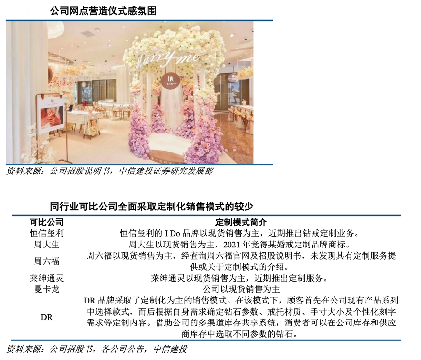 經(jīng)典案例:根據(jù)公司招股說明書、各公司公告、中信建投證券研究發(fā)展部等綜合資訊表明,產(chǎn)品定制化同時(shí),迪阿股份公司門店端進(jìn)行情景化布置進(jìn)一步提升消費(fèi)者體驗(yàn)。其在線下網(wǎng)點(diǎn)的裝修會(huì)主要營(yíng)造 浪漫的場(chǎng)景,進(jìn)一步提高消費(fèi)者體驗(yàn),同時(shí)可按照消費(fèi)者需求提供訂婚儀式等服務(wù),全方位、全流程為消費(fèi)者提升購物體驗(yàn)。