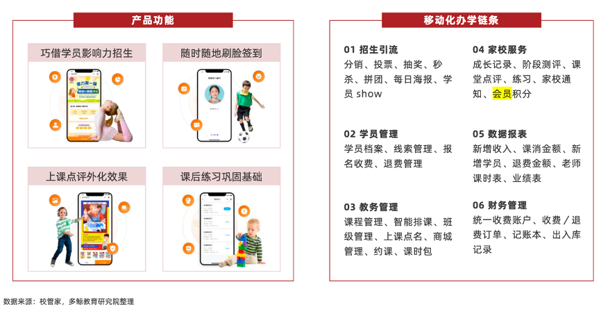 經(jīng)典案例:根據(jù)校管家、多鯨教育研究院等綜合資訊表明,面對(duì)機(jī)構(gòu)轉(zhuǎn)型難題,校管家旗下產(chǎn)品“校管家云校”為素質(zhì)教育機(jī)構(gòu)提供了移動(dòng)化便捷服務(wù)。基于校管家 11 年服務(wù)全國中大型規(guī)模教育機(jī)構(gòu)積累的運(yùn)營管理經(jīng)驗(yàn),校管家云校提煉了包括招生引流、學(xué)員管理、教務(wù)管理、家校服務(wù)、數(shù)據(jù)報(bào)表、財(cái)務(wù)管理 6 大流程在內(nèi)的辦學(xué)經(jīng)營鏈路,以解決機(jī)構(gòu)的經(jīng)營管理難題,減輕老師的非教學(xué)工作負(fù)擔(dān)。