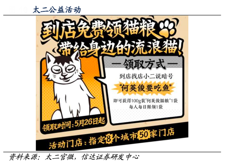 經(jīng)典案例:根據(jù)太二官微、信達(dá)證券研發(fā)中心等綜合資訊表明,太二公司通過定期的會(huì)員活動(dòng)其私域流量進(jìn)行運(yùn)營,例如通過“何英俊公益”救助流浪貓,顧客可以通過店鋪會(huì)員積分換取公益貓糧,吸引眾多粉絲參加,深化品牌形象。根據(jù)其公眾號(hào)數(shù)據(jù),截至 2022 年 1 月 9 日,何英俊貓糧已累計(jì)領(lǐng)取 3.6 萬袋,累計(jì)向各類公益機(jī)構(gòu)捐贈(zèng) 8.9 噸貓糧。