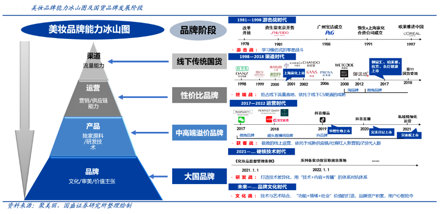 經(jīng)典案例:根據(jù)聚美麗、國盛證券研究所等綜合資訊表明,回顧中國化妝品市場發(fā)展史,行業(yè)競爭要素逐漸沿著“渠道—運營—產(chǎn)品—品牌”演進,國貨品牌則從淺入深向歷史悠久的海外品牌學習趕超,從搭建“產(chǎn)品技術+渠道觸達+營銷內(nèi)容”體系的硬實力,再逐漸上升到品牌整體“審美+設計+文化”的軟實力。