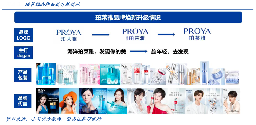 經(jīng)典案例:根據(jù)公司官方微博、國盛證券研究所等綜合資訊表明,珀萊雅高度重視品牌建設, 2018-2021H1 形象宣傳推廣費率分別達21.2%/26.9%/32.7%/34.0%。從外在展示到產(chǎn)品內(nèi)容全方位升級,一方面使品牌調性更貼近年輕化消費者,如主打 slogan 變?yōu)?ldquo;趁年輕,去發(fā)現(xiàn)”,所選取代言人兼具流量與圈層,針對面膜/精華/彩妝 等不同系列產(chǎn)品線靈活選取不同年齡段的明星助力推廣;另一方面則使品牌調性更具科 技感,如產(chǎn)品包裝更為簡約大方,突出核心成分及主打功能。