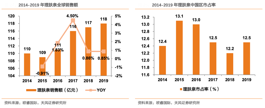 經(jīng)典案例:根據(jù)歐睿國際、天風證券研究所等綜合資訊表明,結(jié)合歐睿咨詢統(tǒng)計,2014-2019年理膚泉全球銷售額年復(fù)合增長率1.4%,2019年理膚泉品牌全球銷售額達118億元,同比增0.85%。其中理膚泉在中國區(qū)市場占比12.5%。僅次于薇諾娜、雅漾。其以敏感肌為目標人群,找準剛需市場,更易完成現(xiàn)有流量變現(xiàn)。