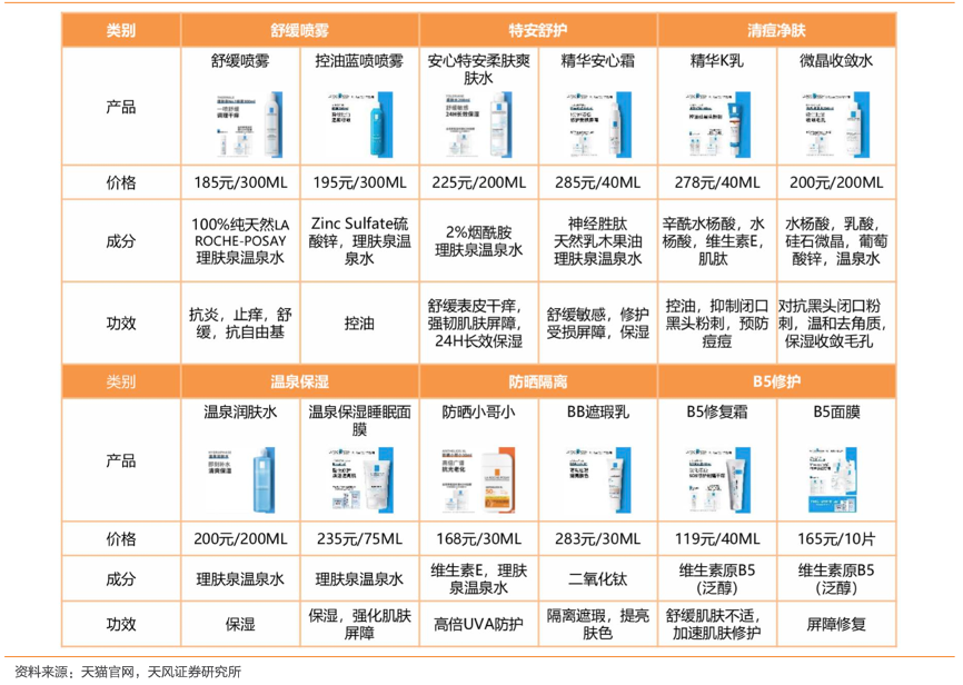 經(jīng)典案例:根據(jù)天貓官網(wǎng)、天風證券研究所等綜合資訊表明,理膚泉產(chǎn)品分為以下六個系列:1)舒緩噴霧:補水、保濕、舒緩噴霧;2)特安舒護:保濕、舒緩肌膚、修護;3)清痘凈膚:修護、滋養(yǎng)、舒緩修護;4)溫泉保濕:補水、保濕、水潤清透;5)防曬隔離:補水、防曬、隔離、清爽;6)營潤身體:保濕、滋潤、修護、滋養(yǎng)肌膚。其產(chǎn)品生產(chǎn)嚴格遵循 GMP 標準,包裝無菌安全。