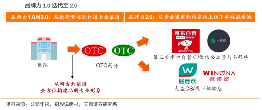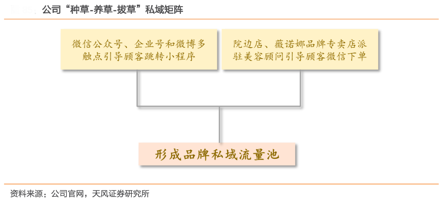 經(jīng)典案例:根據(jù)公司官網(wǎng)、天風(fēng)證券研究所等綜合資訊表明,薇諾娜整合線上、線下渠道優(yōu)勢(shì),從線下看,其通過其駐有 BA 的院邊店和數(shù)量龐大的藥房終端,將客流轉(zhuǎn)化為線上私域流量。從線上看,薇諾娜通過微信、微博進(jìn)行義診和專業(yè)化的產(chǎn)品教育,吸引粉絲關(guān)注,從線上渠道積攢私域流量。