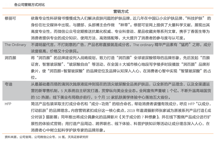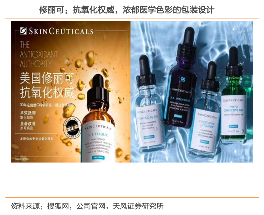 經(jīng)典案例:根據(jù)搜狐網(wǎng)、公司官網(wǎng)、天風(fēng)證券研究所等綜合資訊表明,功效性護(hù)膚品牌持續(xù)以專業(yè)性研究成果為產(chǎn)品效果背書,以最優(yōu)化配方原則開發(fā)單品,產(chǎn)品營銷多以產(chǎn)品+功效命名強(qiáng)化概念。國際品牌中,修麗可以“科技護(hù)膚”身份出現(xiàn),官網(wǎng)提供大量科學(xué)文獻(xiàn),微信公眾號定期推送抗氧化權(quán)威、專業(yè)科普說等系列文章。