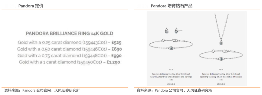 經(jīng)典案例:根據(jù)Pandora公司官網(wǎng)、天風(fēng)證券研究所等綜合資訊表明,Pandora 對于培育鉆石在終端市場的定位和Lightbox 十分相似,即“時(shí)尚珠寶”,與天然鉆石所代表的“高端、奢侈、稀缺、恒久”形成了較大對比。其產(chǎn)品售價(jià)格也較低,目前大致在 900 美元/0.5 克拉左右,“低價(jià)” “時(shí)尚”的產(chǎn)品定位有助于其精確瞄準(zhǔn)受眾群體。