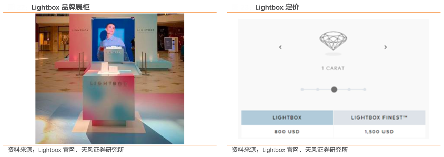 經(jīng)典案例:根據(jù)Lightbox官網(wǎng)、天風(fēng)證券研究所等綜合資訊表明,作為 De Beers 旗下的獨(dú)立子公司,Lightbox 在2018 年推出時(shí)就得到了 De Beers 技術(shù)公司 1 億美元投資的支持,為消費(fèi)者提供品質(zhì)卓越、價(jià)格適中的培育鉆石。該品牌 還是集團(tuán)旗下唯一使用子公司 Element Six 鉆石實(shí)驗(yàn)室提供的技術(shù)用合成鉆石的珠寶品牌。